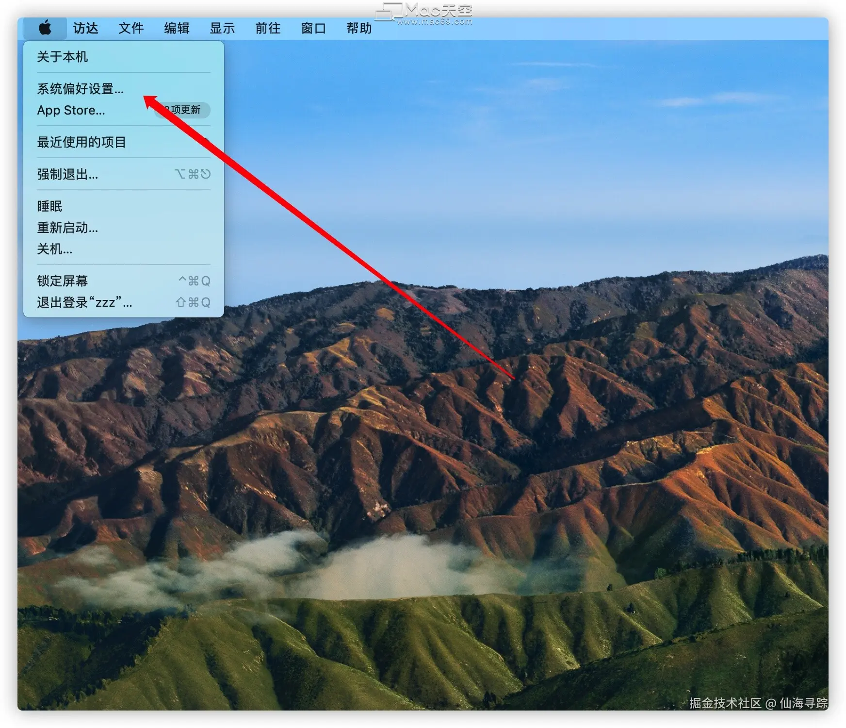 一、首先进入Mac系统桌面,然后点击最左上角的苹果图标,在下拉菜单中选择【系统偏好设置】进入设置,如下图所示。