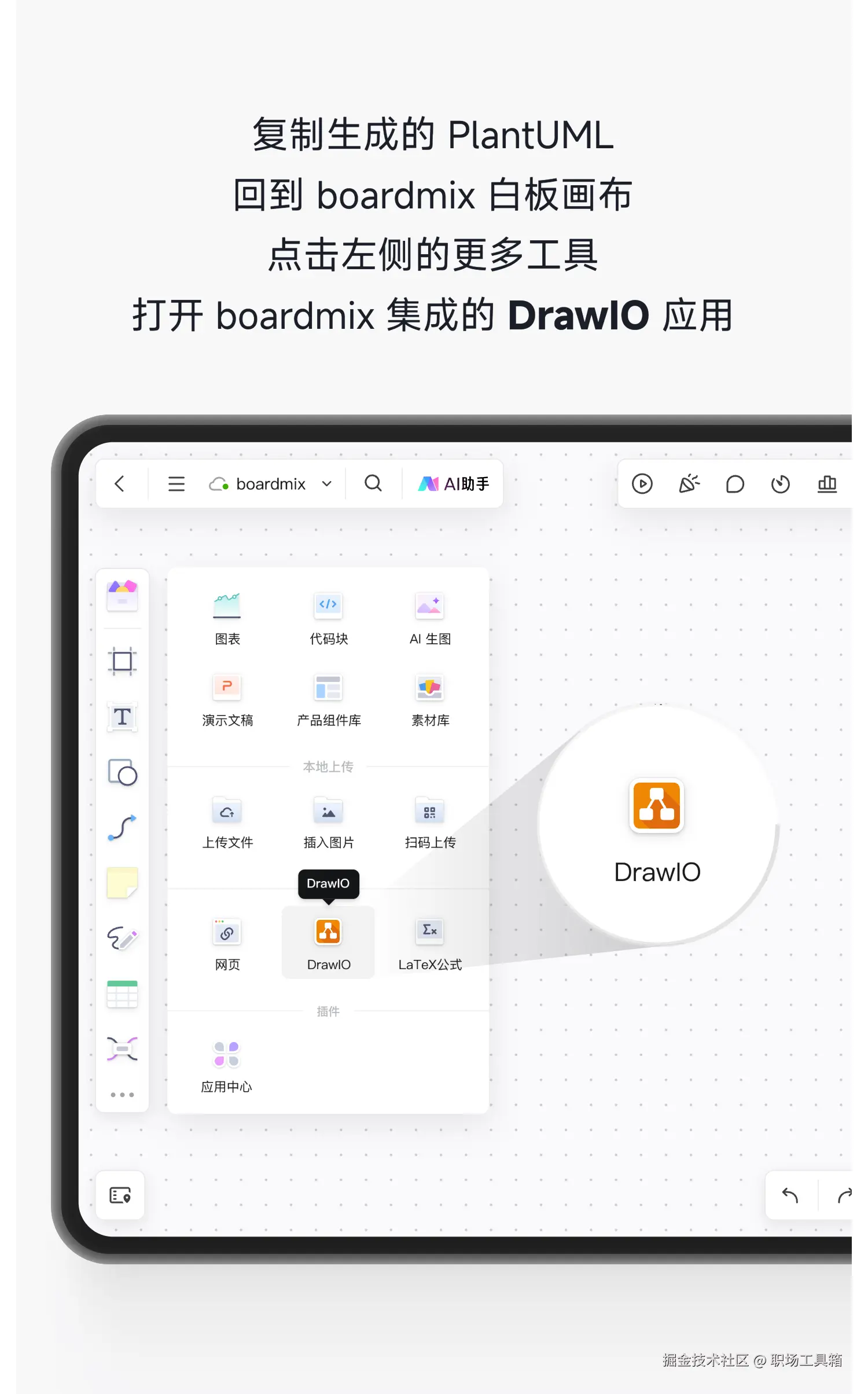 打开任意一个boardmix文件,点击左侧工具栏的更多工具,打开boardmix集成的DrawIO应用。