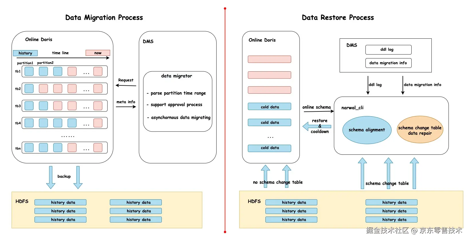 Doris2.0完成升级后启动建设冷热数据分层,首先需要将结转至外部存储的历史数据恢复至线上环境。此时遇到的最大问题是线上表结构已发生多次变更,导致多次结转的历史数据备份snapshot文件所对应的schema结构与线上表不一致。为了解决schema不一致的问题,我们设计开发了一套自动化数据恢复工具narwal_cli,如下图中Data Restore Process过程所示,narwal_cli工具支持自动对齐历史结转数据和Doris 集群中数据的的schema,并定向恢复至线上环境。