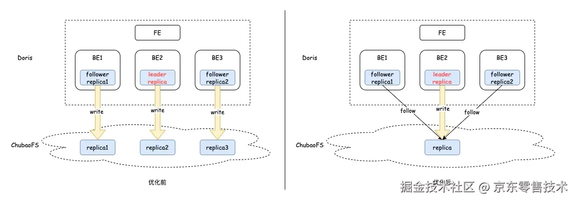 Apache Doris 2.0中冷数据在进行Schema Change时,同一份数据的多个副本之间相互独立进行(SC)。如此, Schema Change完成后造成冷数据将在远端存储存在多份,造成存储资源浪费的同时也降低SC任务执行效率。为了解决这个问题,参考Raft协议对冷数据多副本SC场景进行了优化。即SC只在选举出来的Leader副本上执行,非Leader副本只生成元数据。