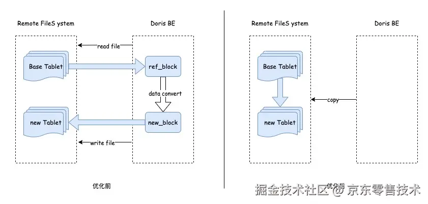 针对冷数据 Add Key Column类型的SC 退化成 Direct Schema Change 导致 SC 任务执行缓慢的问题,我们对冷数据Add Key Column类型SC的流程进行深度优化,利用远端存储系统(ChubaoFS)的CopyObject接口,实现在远端直接进行数据复制,避免数据文件从远端拉取到Apache Doris,经数据重写后再存储到远端存储系统的巨大IO开销。该优化减少了两次网络传输和一次数据转换的开销,这样能够极大加速Add Key Column场景下冷数据Schema Change的执行速度。经测算优化后SC执行速度提升40倍, 相关PR已合并社区2.0分支:github.com/apache/dori…。