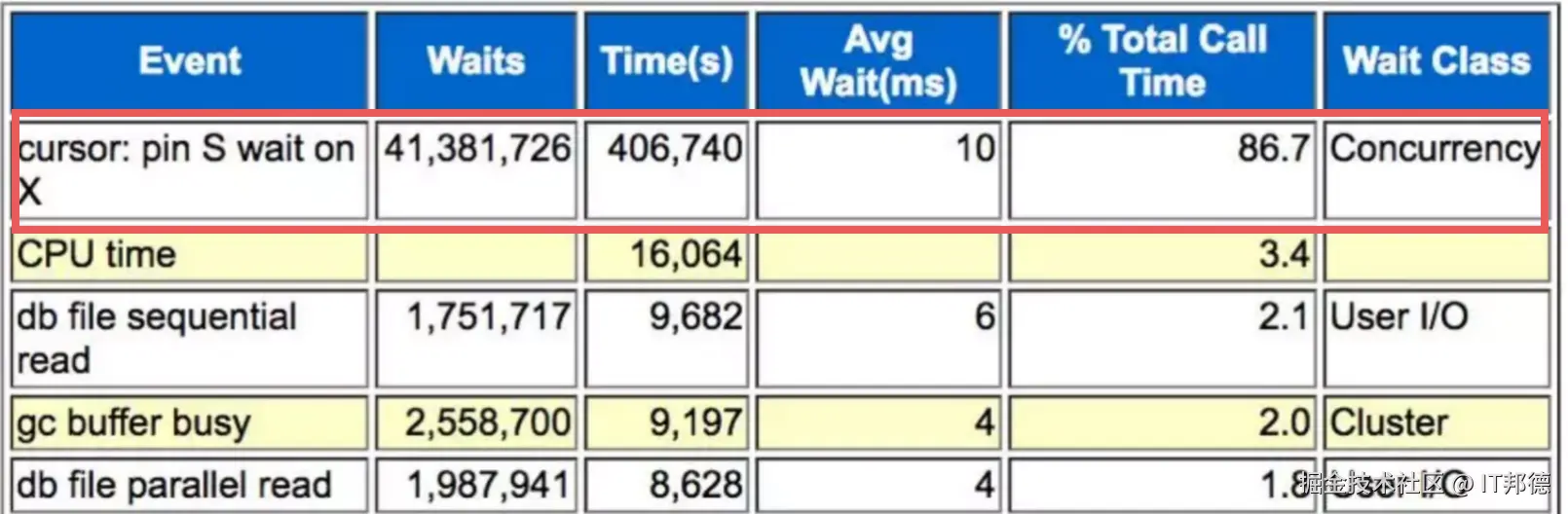 cursor: pin S wait on X等待占比最高,接近90%。这个等待事件的意思是有会话试图以共享模式获取mutiex pin,但其他会话以独占方式持有游标对象的mutex pin,于是造成该等待。
