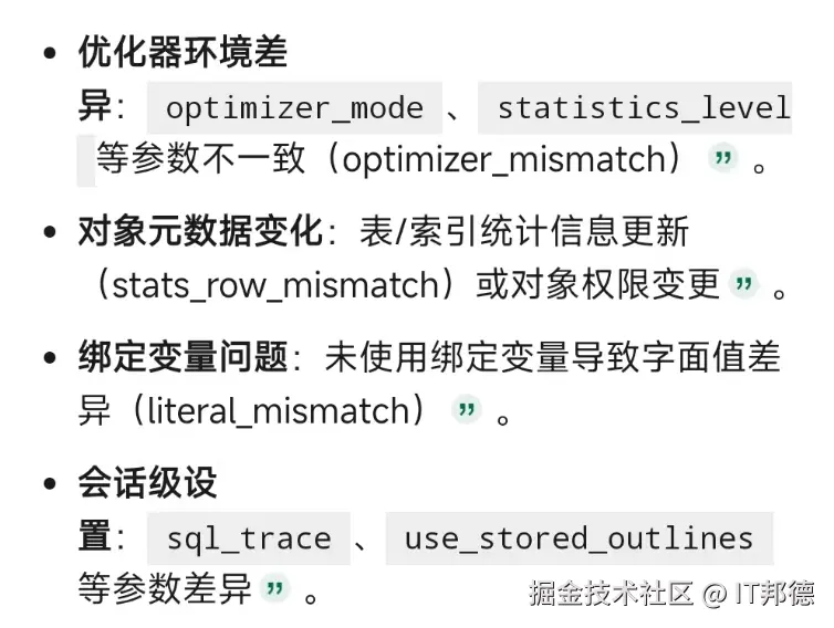 如果cursor_sharing=FORCE或者cursor_sharing=EXACT,但是在数据分布不均的字段上也使用了绑定变量(两者基本上是等同的,虽然后一种略好于前一种情况),那么就要考虑“绑定变量窥视”和“自适应游标”两个参数的影响了。