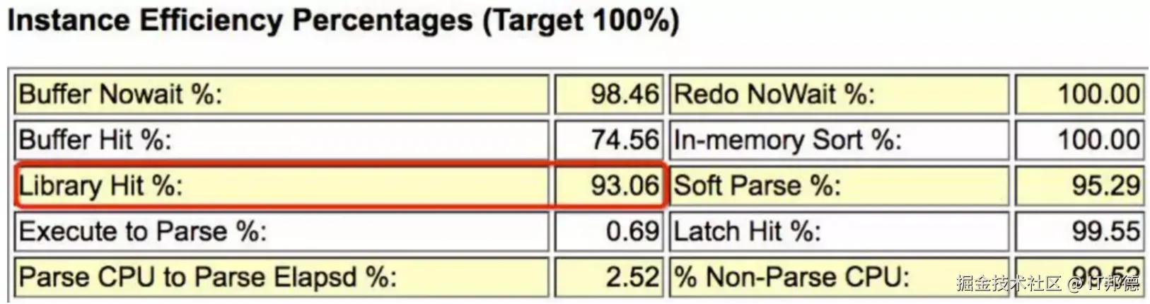 那我们再往下看看命中率,Library Hit比较低,该指标主要代表SQL在共享区的命中率。通常应在95%以上,否则需要考虑加大共享池。