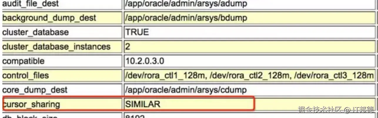 cursor_sharing这个参数对系统性能和稳定性都非常重要,可惜经常被忽略,建议使用该参数的默认值:即 cursor_sharing=EXACT,而不是FORCE或similar。