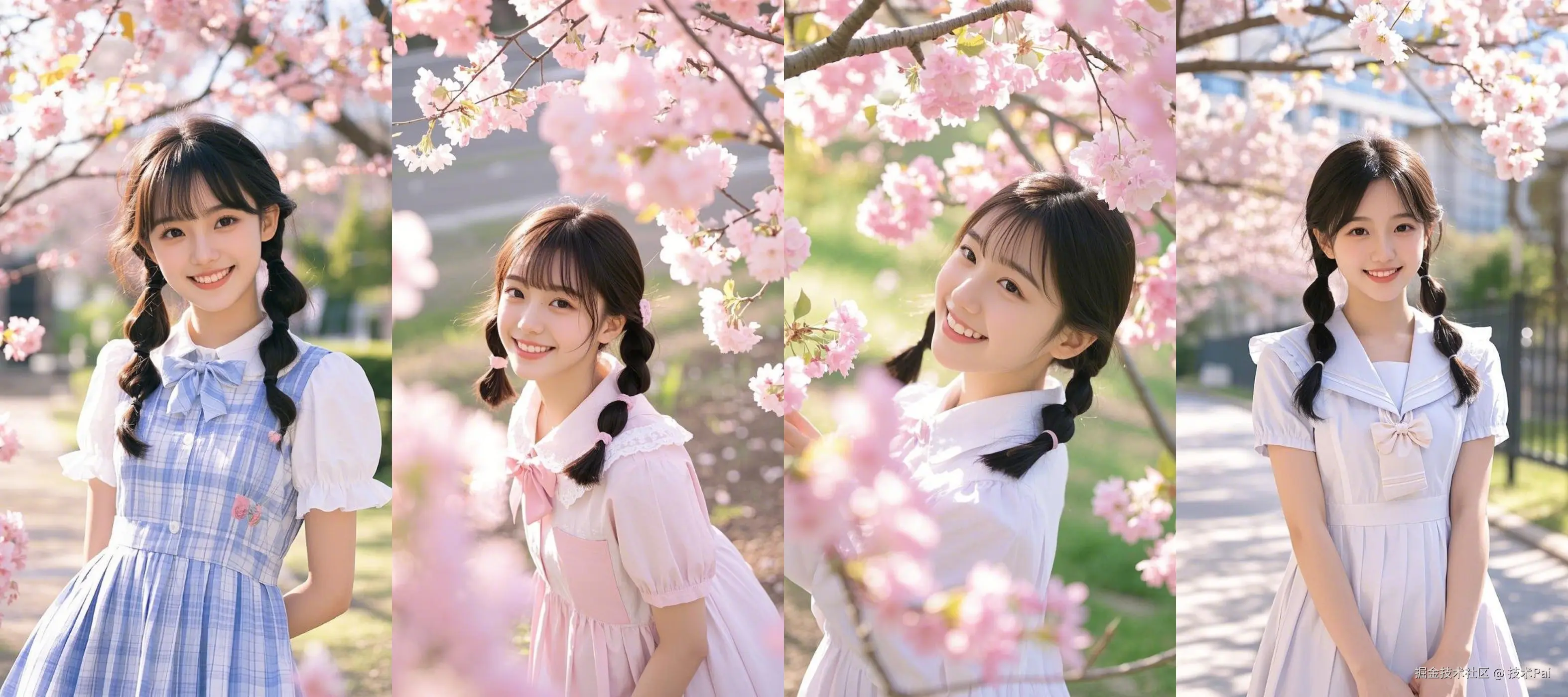 提示词:画年轻女孩, 清纯甜美的脸部特征, 可爱双马尾的发型, 甜美微笑的表情, 甜美连衣裙的服装, 在樱花校园场景下, 甜美站姿的姿势, 清晨暖阳的光线, 日系清新的风格, 年龄17岁, 超精致可爱女孩肖像, (8k超高清:1.3), (最佳品质:1.4), (完美细节:1.3), (精致渲染:1.2)