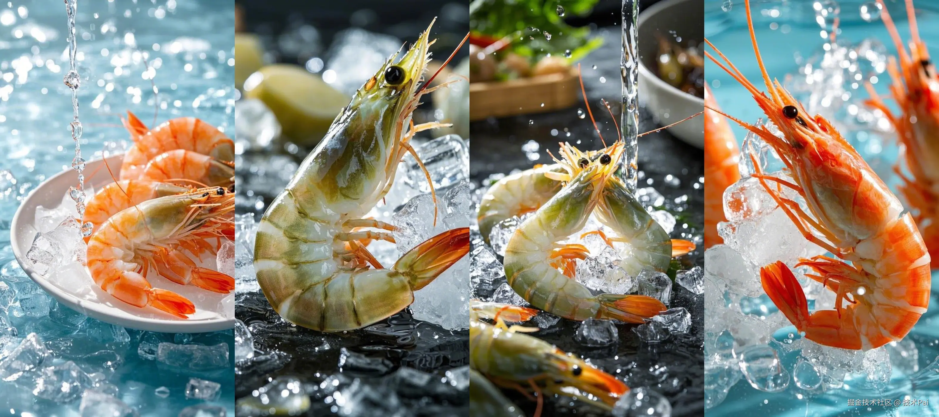 提示词:食材特写摄影, 专业美食摄影, 大虾, 新鲜活虾晶莹剔透, 碎冰水滴晶莹, 45度侧打质感光, 微距特写构图, 突出食材的新鲜质感, 新鲜质感展现, 食材本味呈现, 视觉诱惑营造, (8k超高清:1.3), (完美品质:1.4), (精致细节:1.4), (商业摄影:1.2)
