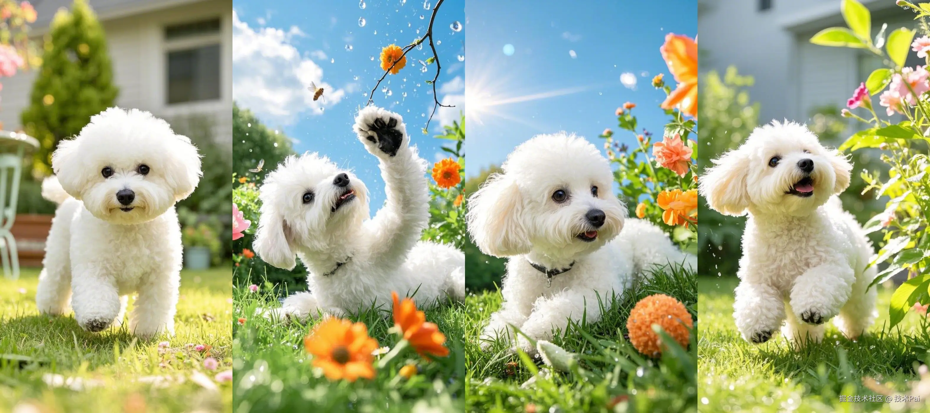 提示词:宠物照片, 可爱比熊小狗宠物, 在花园庭院场景, 玩耍嬉戏的动作, 可爱呆萌的表情, 温暖阳光的光线, 清新自然的风格, 正面特写的角度, 营造温馨可爱的氛围, 宠物图片效果图, 萌趣可爱, (8k超高清:1.3), (最佳品质:1.4), (完美细节:1.3), (精致渲染:1.2)