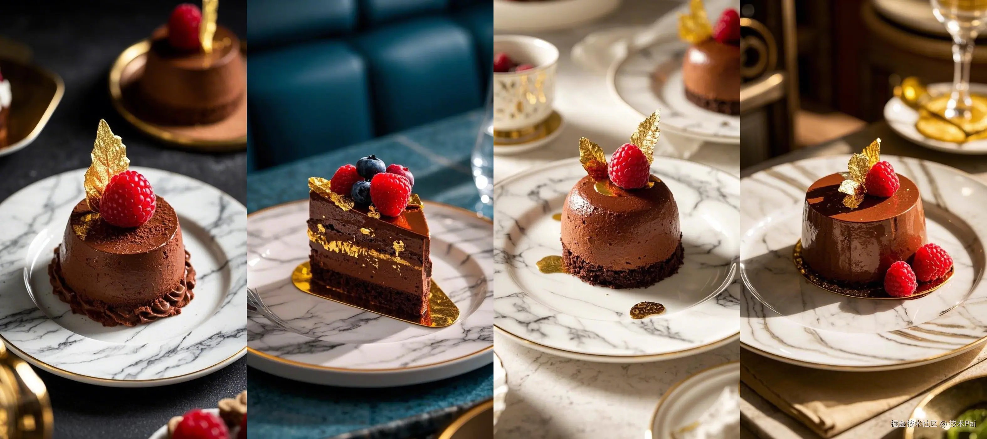 提示词:精致甜点展示, 专业美食摄影, 巧克力慕斯, 金箔片配树莓果, 大理石纹金边盘, 45度侧打柔光, 中央主体突出, 展现甜点的精致艺术感, 甜点艺术呈现, 精致美感塑造, 视觉诱惑营造, (8k超高清:1.3), (完美品质:1.4), (精致细节:1.4), (商业摄影:1.2)