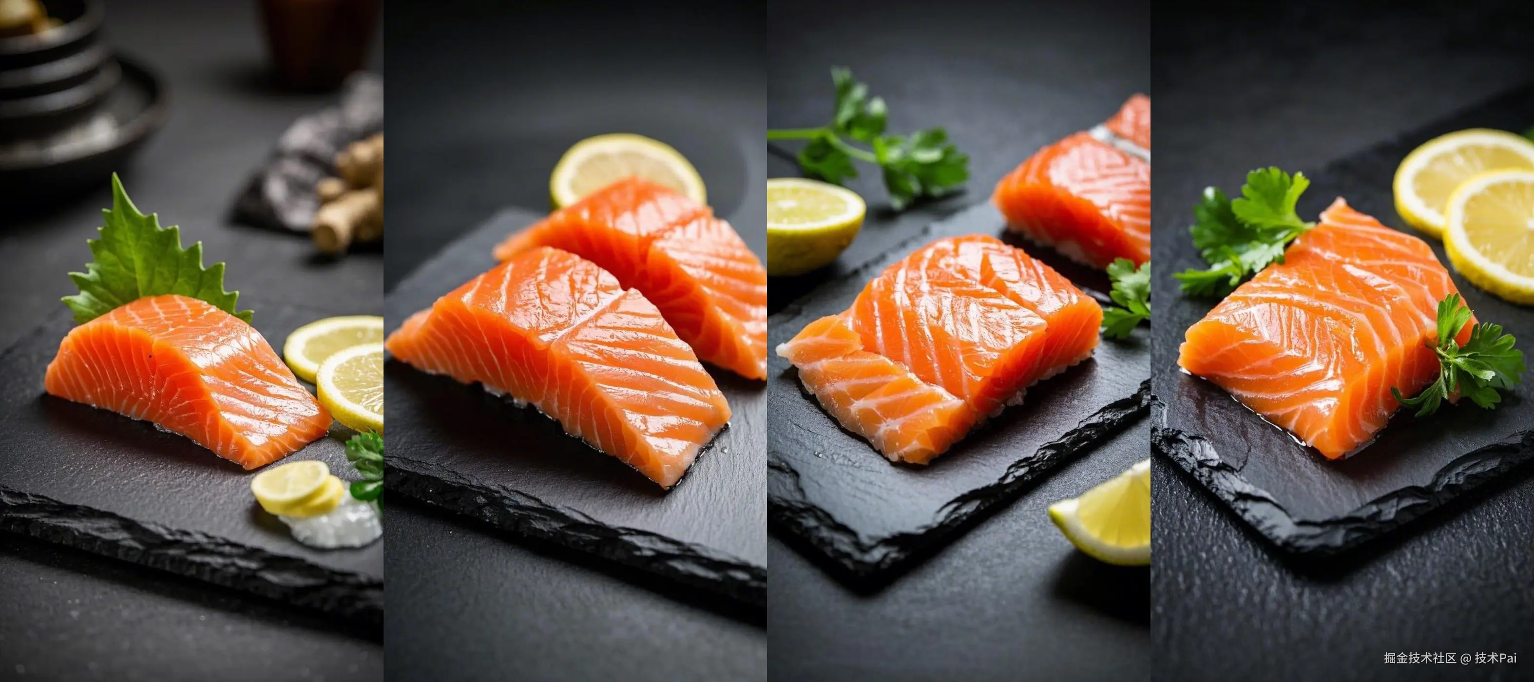 提示词:美食食材摄影, 专业美食摄影, 三文鱼刺身, 油亮剔透、纹理清晰, 磨砂黑石板配柠檬, 45度侧打光突出质感, 特写微距构图, 突出食材的质感美学, 食材质地展现, 纹理细节刻画, 视觉美感塑造, (8k超高清:1.3), (完美品质:1.4), (精致细节:1.4), (商业摄影:1.2)