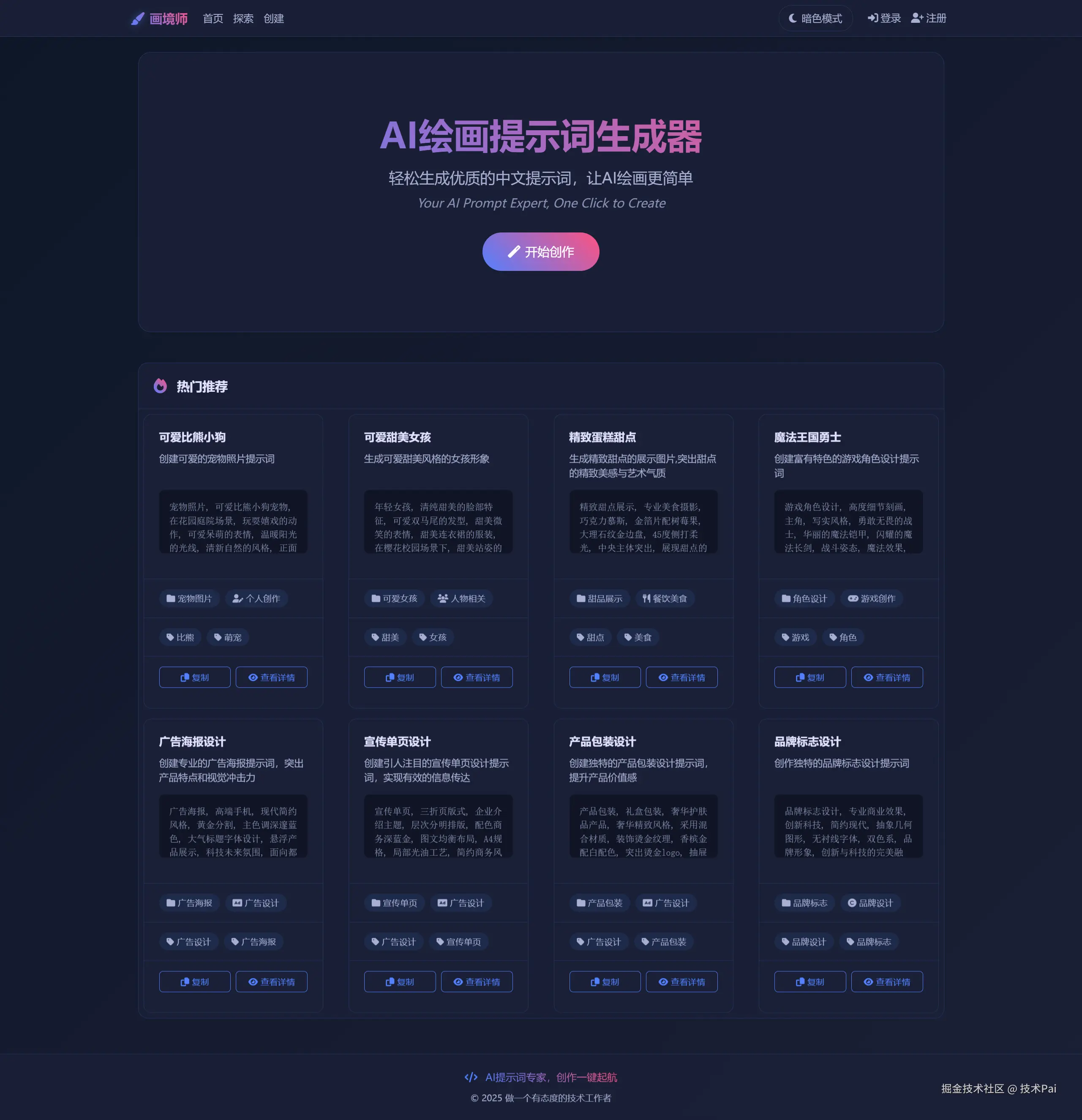 画境师是一个完全免费的AI绘画提示词生成平台,致力于为所有创作者提供优质的创作支持。
