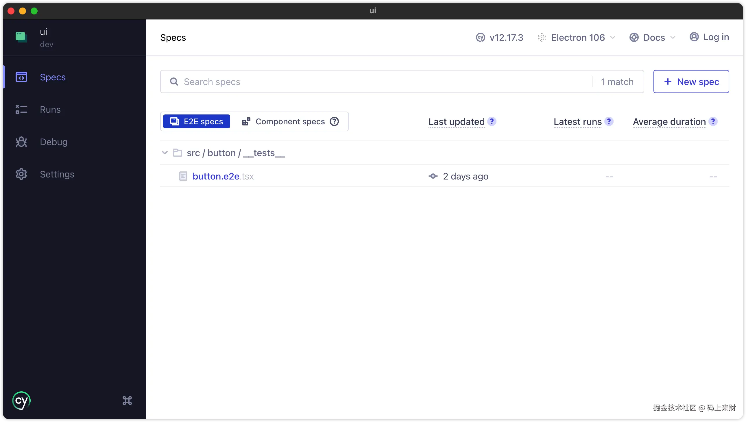 baseUrl,这样在用例中就可以使用相对地址了module.exports = defineConfig({ e2e: { baseUrl: "http://localhost:10020", // 配置web基本地址 video: false, # 不生成视频 screenshotOnRunFailure: false, # 不生成快照 supportFile: false, # 不设置全局配置 specPattern: "src/**/*.e2e.(tsx|ts)", # 设置端测用例的位置 }, }); - 新建button组件的测试用例:
