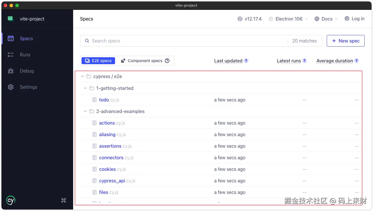 cypress/support/**,可以自行修改,如果没有全局的配置请设置成false - experimentalRunAllSpecs:值为true时测试界面会有一个测试全部用例的按钮,默认会false