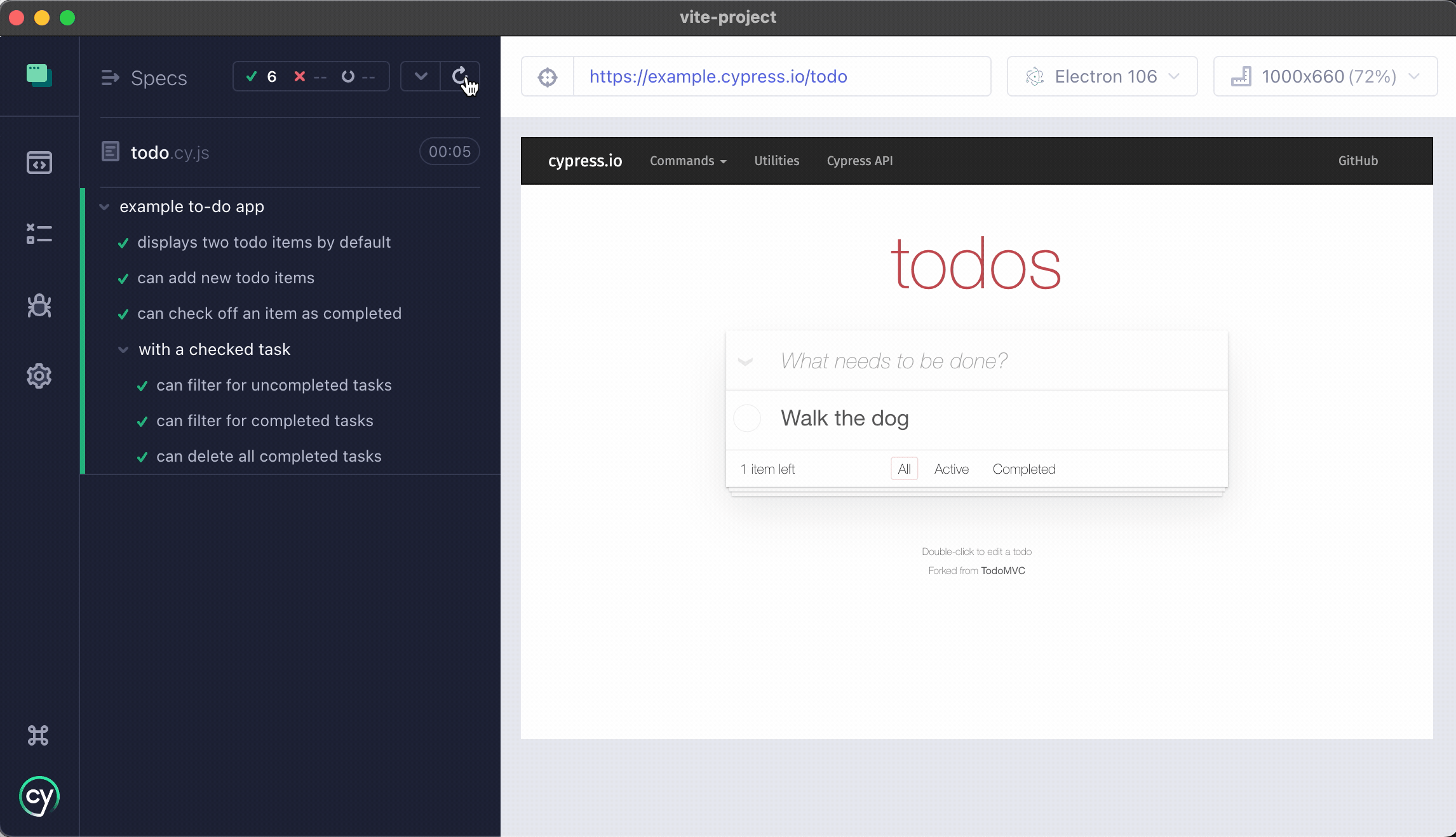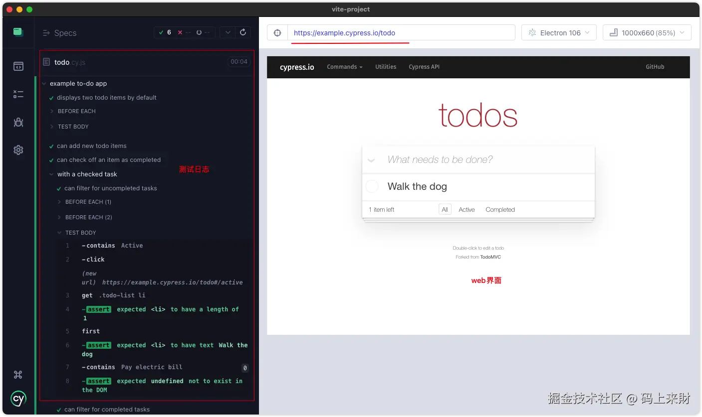 这些单测例子中随便点击一个就会测试对应的用例,这里我们点击todo.cy.js就可以开始测试了