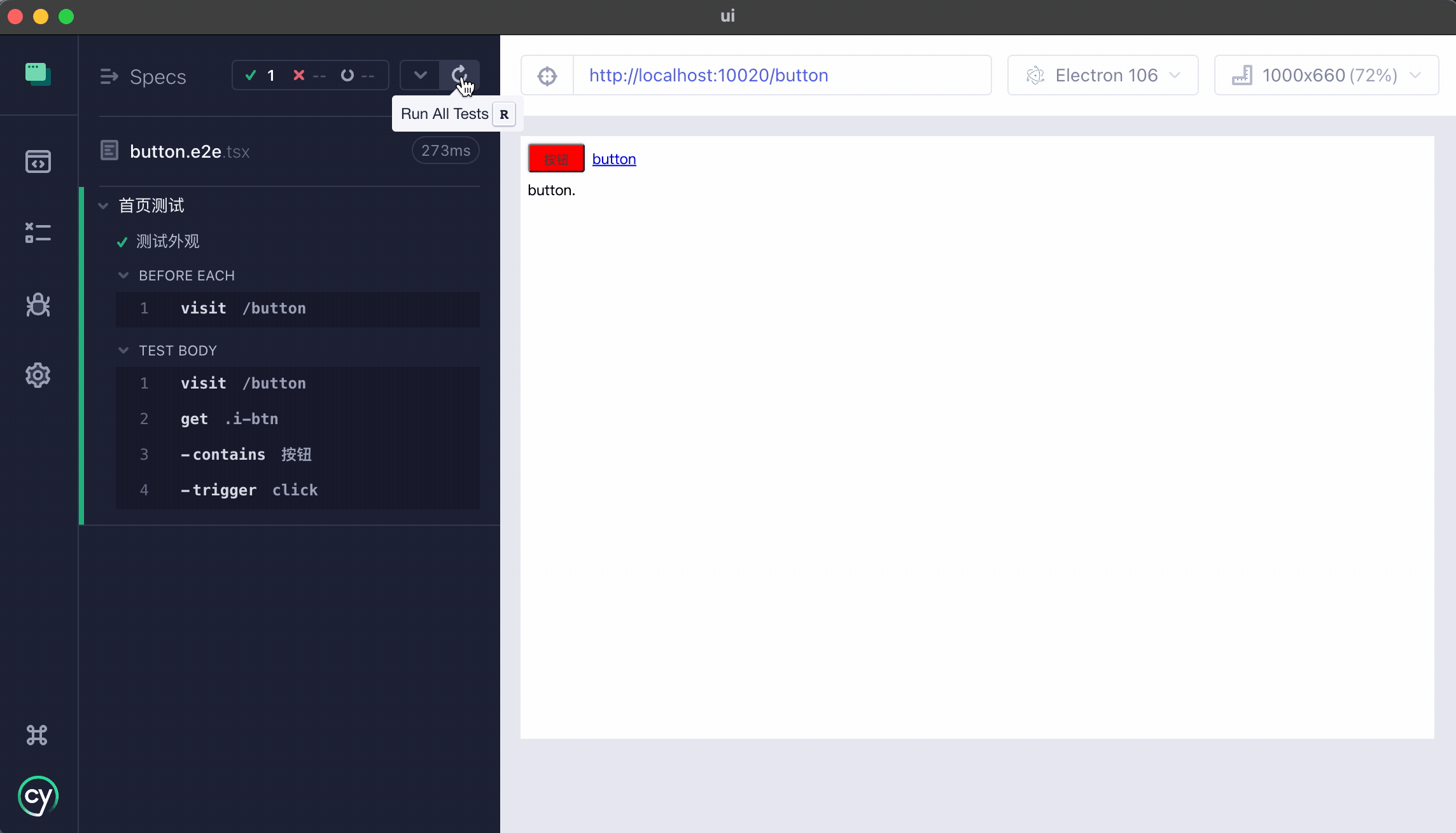 // src/button/__tests__/button.e2e.tsx /// <reference types="cypress" /> describe("首页测试", () => { it("测试外观", () => { cy.visit("/button"); cy.get(".i-btn").contains("按钮").trigger("click"); }); }); - 启动测试: