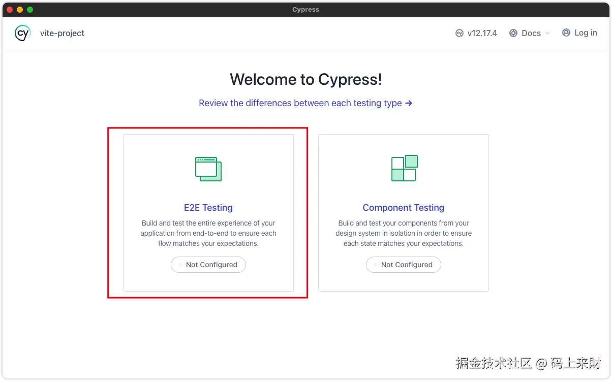 或者直接使用./node_modules/.bin/cypress open。启动后出弹出cypress的界面,可以进行端到端测试和组件测试。从下图界面可以看出不管是端测还是组件测试都没有配置(Not Configured),这里我们选择第一个端到端测试: