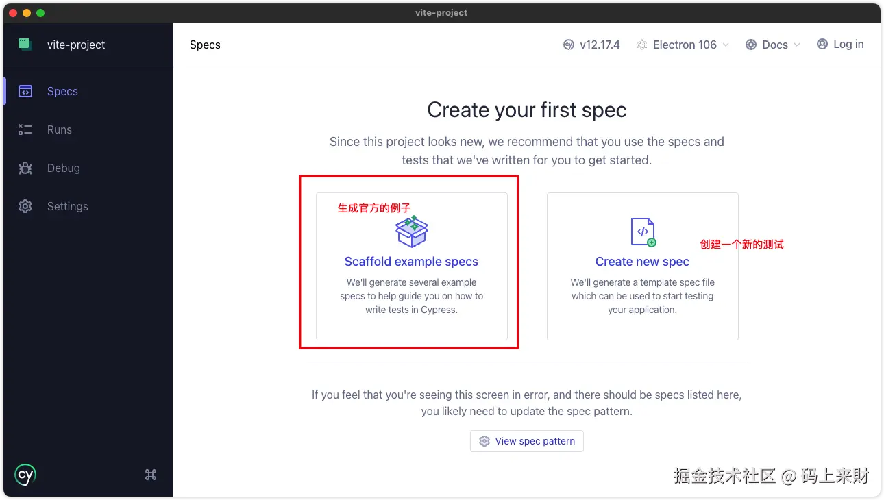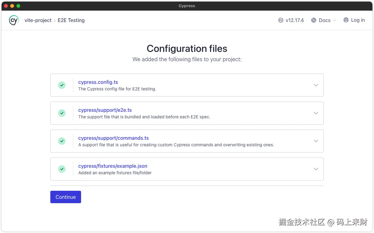 进去后由于是初次使用cypress会引导对项目做初始化配置,点击Continue会在项目中生成对应的文件: