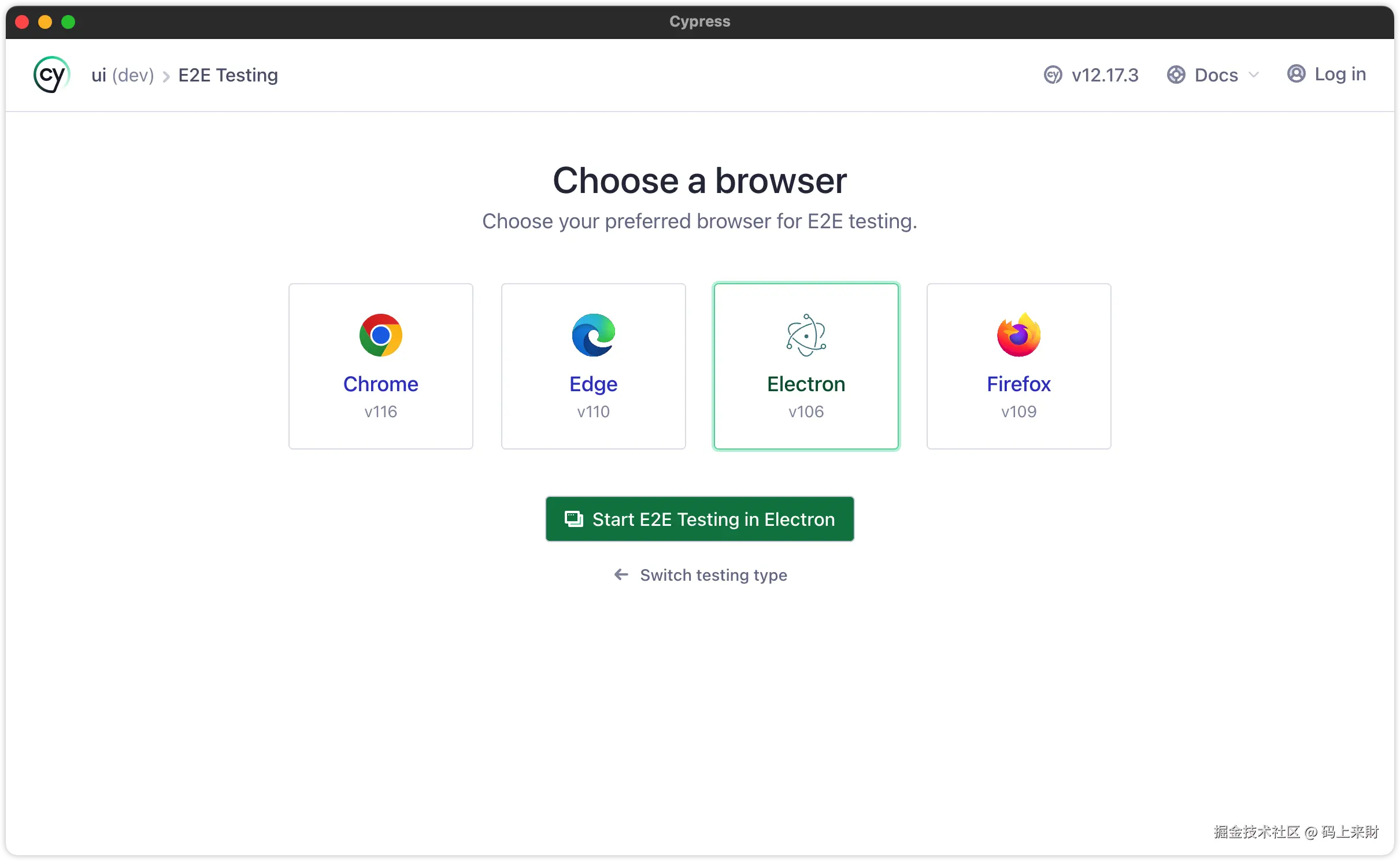 端到端测试cypress会检测本地计算机安装的浏览器,你可以选择要用哪个浏览器进行测试,或者使用electron。这里我选择使用electron