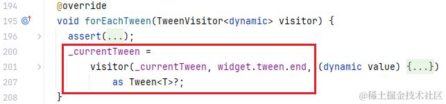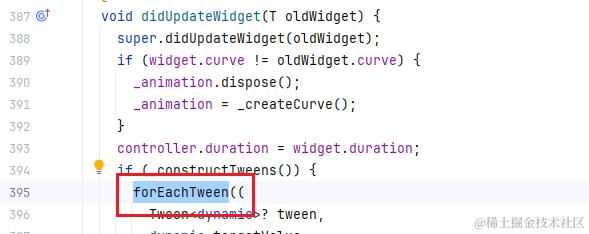当外界触发更新时,ImplicitlyAnimatedWidgetState 中的 didUpdateWidget 会触发,其中执行 forEachTween 的抽象方法,该方法将有子类实现,处理补间的具体更新逻辑: