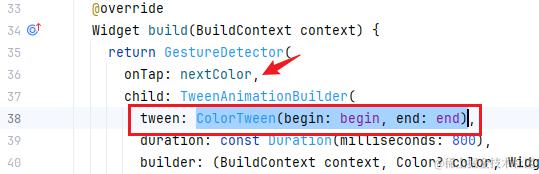 在 TweenAnimationBuilder 构造时取用 begin 和 end 构建新的颜色补间即可,点击时触发 nextColor 更新到写一个颜色索引。