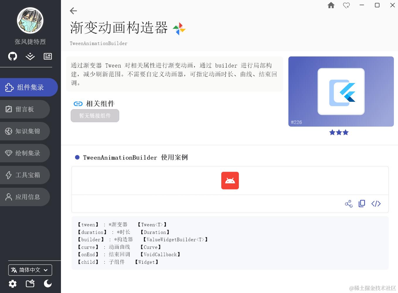 当你想要让一个组件在出现时就具有动画效果,又懒得使用动画控制器,还懒得触发属性更新使用隐式动画。那么 TweenAnimationBuilder 将可以很好地帮助你完成动画效果。该组件已收录到 FlutterUnit,感兴趣的朋友可以参阅。