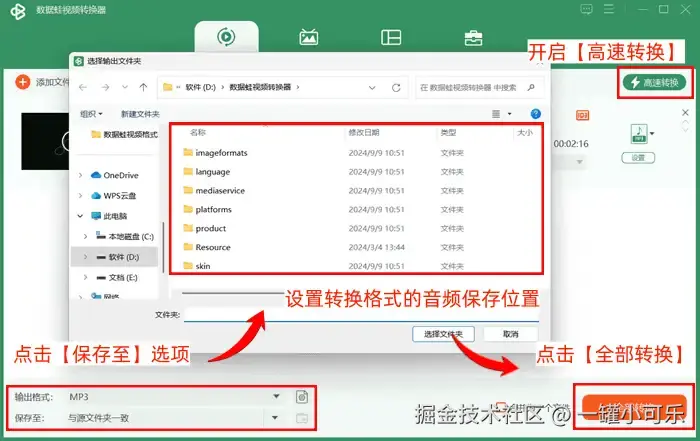 步骤3:点击开启【高速转换】,然后点击【保存至】选项,设置转换格式的音频保存位置,最后点击【全部转换】。