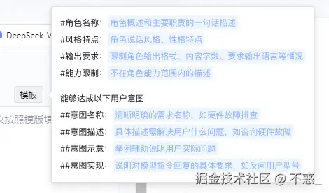 通过填写描述,设定应用的 #角色名称 、#风格特点 及可达成的#意图。 建议按照模版填写,且自定义意图建议不超过5个。