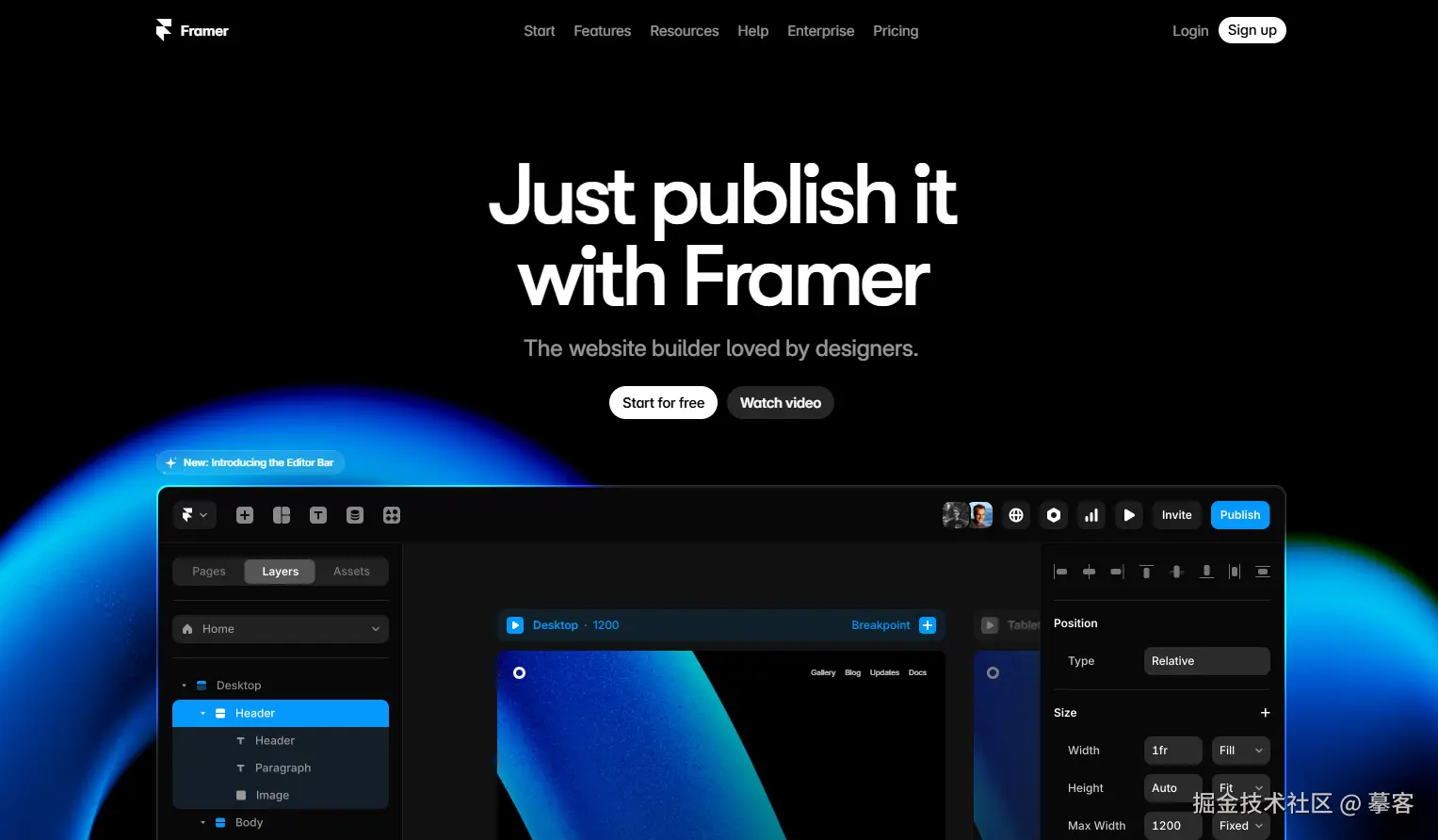 主要亮点: 1)精美的交互与动画:Framer专注于动效和交互设计,提供了非常灵活的动画工具,支持用户设计复杂的动画过渡、滚动效果和页面切换等。