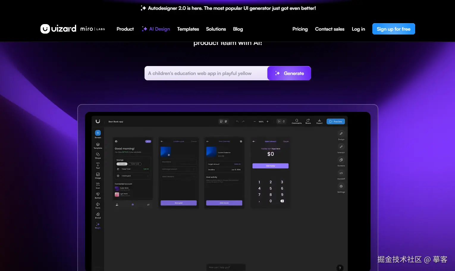 主要亮点: 1)AI驱动的设计生成:Uizard的一大亮点是其AI驱动的设计功能,用户可以通过上传图片或简单的文字描述,让工具自动生成原型设计。这种智能化的设计方式,不仅提高了效率,还大大降低了入门门槛,尤其适合那些没有太多设计经验的用户。