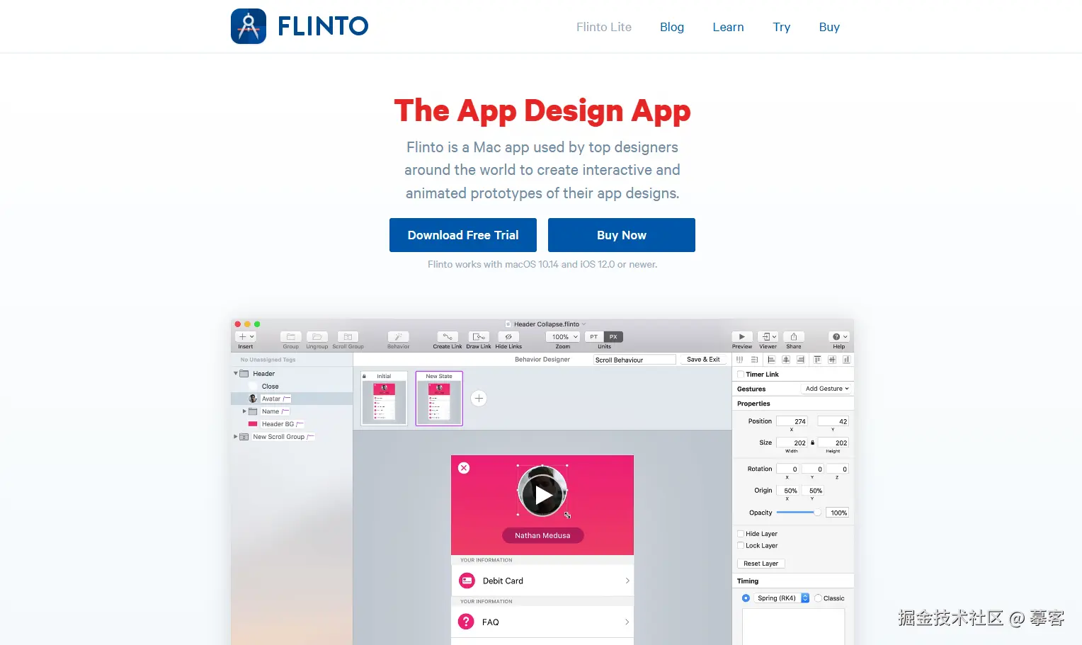 2)简单的界面和操作:界面非常直观,操作也十分简单。设计师只需要通过拖拽元素、调整属性,就可以轻松制作出带有动画效果的交互原型。此外,Flinto还提供了丰富的模板和示例,帮助新手快速上手。