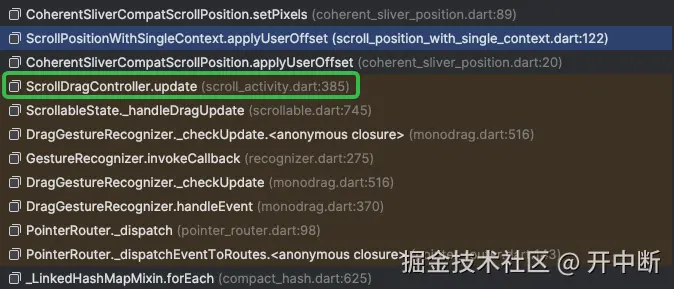 它是手指在滚动Scrollable时,不断产生Update事件的控制器,一旦Scrollable开始一次Drag行为,一个ScrollDragController对象就会被创建,然后关联到ScrollableState上,后续这个State对应的Element在不断地接收到来自系统的滚动事件时,就直接会派发到这个ScrollDragController之上,而ScrollDragController会调用相关的方法来设置ScrollPosition的偏移数值,然后更新RenderObject: