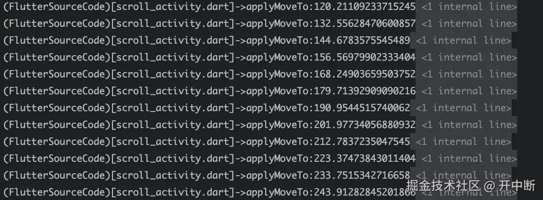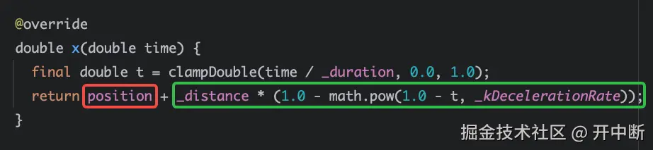 其中的position数值是当前ScrollActivity对应的可滚动组件(Scrollable)的偏移量,也就是对应的ScrollPosition的pixels变量;而绿色部分则是delta,即根据t simulate出来的数值simulate出来的数值,这俩个数值相加返回的数值其实是ScrollPosition在当前惯性滚动动画下的newPixels。