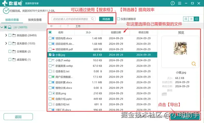 步骤2: 在软件扫描结束后,在指定位置选择出自己所需文件,点击【导出】;
