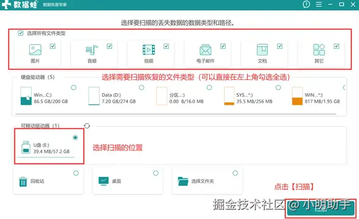 步骤1: 从电脑中打开数据 蛙恢复专家,在首页中选择需要扫描的文件类型和SD卡的读卡器,选好这两项后点击【扫描】;