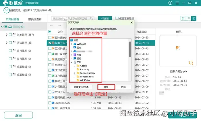 步骤3: 点击完【导出】后,在【浏览文件夹】的弹窗中选择恢复文件的存放硬盘。