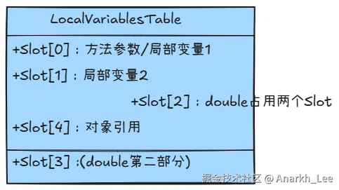 boolean/byte/char/short/int/float占1个Slot long/double占2个连续Slot- 对象引用: