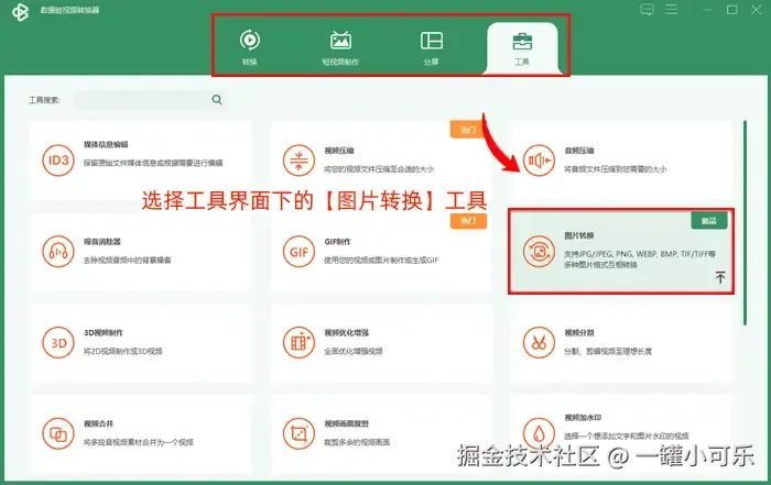 步骤1:运行数据 蛙视频转换器,点击进入【工具】选项界面,然后选择该界面下的【图片转换】工具。
