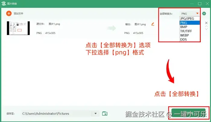 步骤3:在图片格式转换界面,点击右上角的【全部转换为】选项,下拉选择【png】格式,最后点击【全部转换】按钮即可。