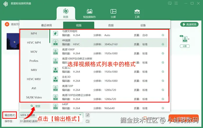 步骤2. 点击格式转换界面左下方的【输出格式】选项,并选择视频格式列表中的格式。在此步骤,您还可以根据需要,对转换的视频进行帧率/清晰度/音频格式等进行设置。