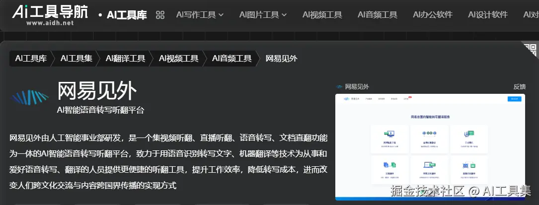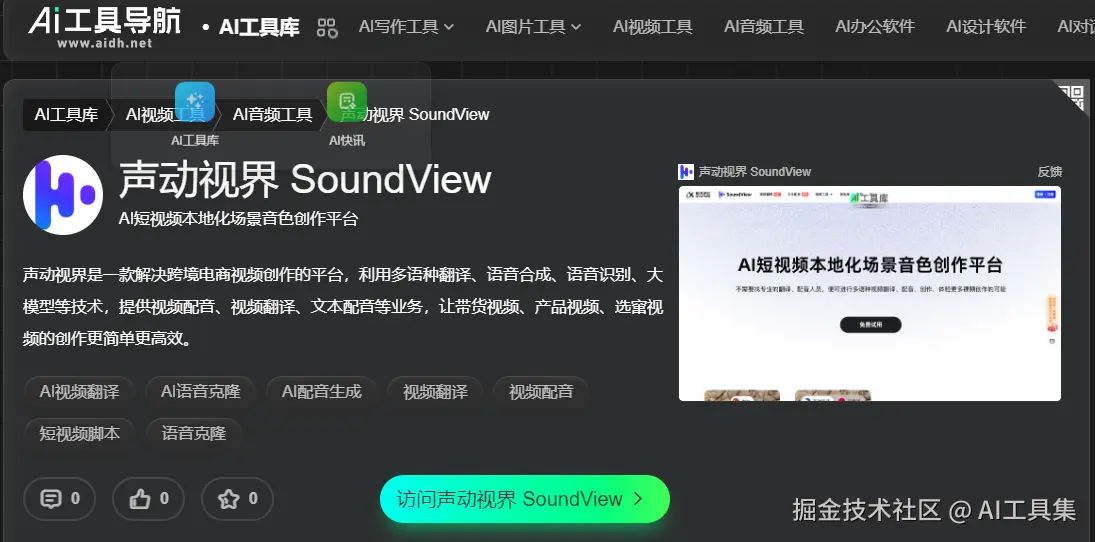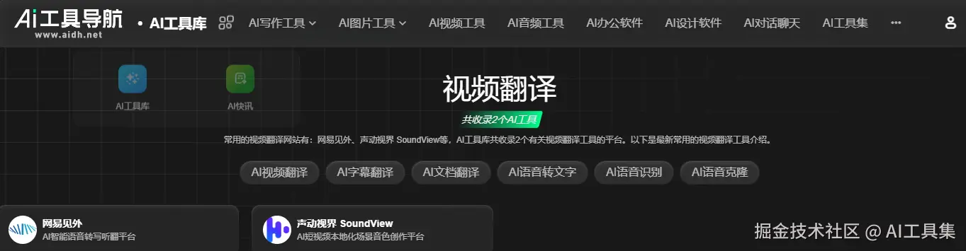 全球化的技术交流和日常的生活娱乐中,我时常会面临语言障碍的挑战。而网易见外和声动视界SoundView这两款AI 视频翻译工具,就像我的得力助手,帮我轻松跨越了语言鸿沟。这两款工具都能在AI工具导航找到。