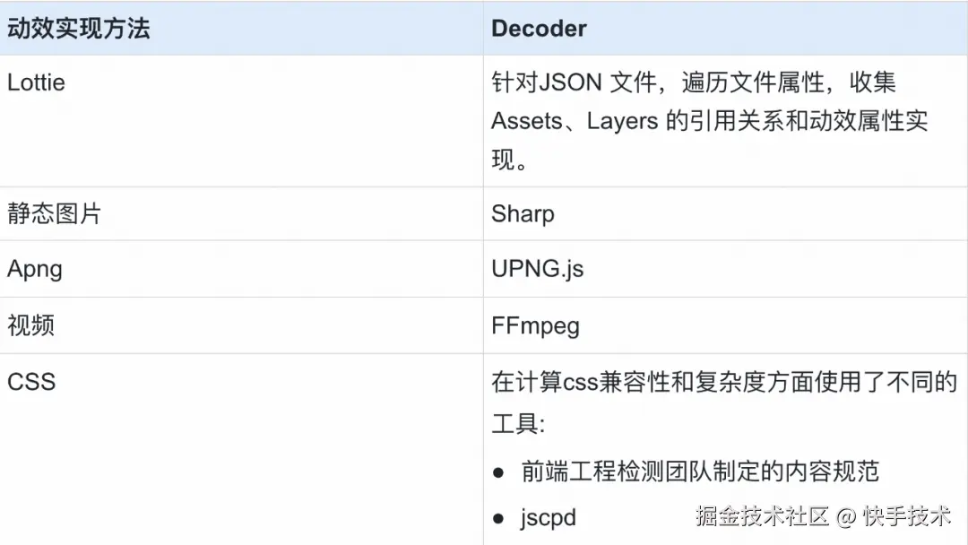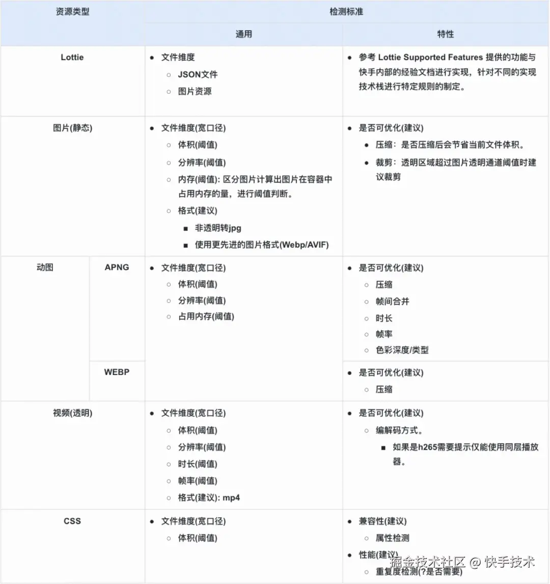 在完善检测服务后,我们意识到需要一套标准来规范动效资源的质量。因此,我们基于快手春节活动(CNY)及日常活动中的丰富实践经验,制定了一套动效临时检测标准。这些标准专注于平台上常用的动态效果格式,确保在不同应用场景下的动效资源都能达到预期的质量和性能。