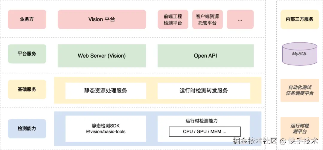 为了实现交付流程中的准入和准出检测,Vision 构建了一套基础检测服务。该服务涵盖基础检测功能、独立检测服务、平台转发/开放服务,以及最终面向业务方的检测服务。此外,还涉及数据库、自动化测试任务调度平台和运行时检测平台等内部第三方服务。