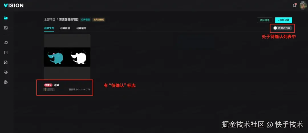 强规则卡控流程:对于强规则卡控的项目,动效设计师上传未通过检测的资源将进入待确认列表,而非检测通过列表。待确认列表中的动效需经研发负责人或动效 BP 人工确认后,才能被研发人员正常使用。只有经过人工确认的资源,才会出现在检测通过列表中,供研发人员下载和使用。