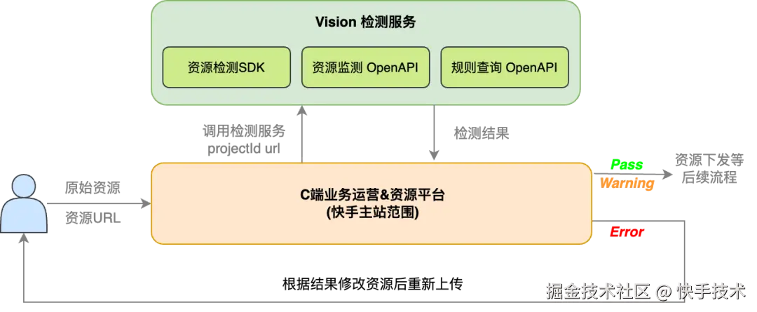 除了在 Vision 平台的检测功能的亮相,检测基础服务 还将功能打包,作为 Open SDK 和 API 对外输出检测能力。借助内部检测质效专项的推动,目前已经完成了在快手主站内多个 C 端核心运营 &资源平台的接入。