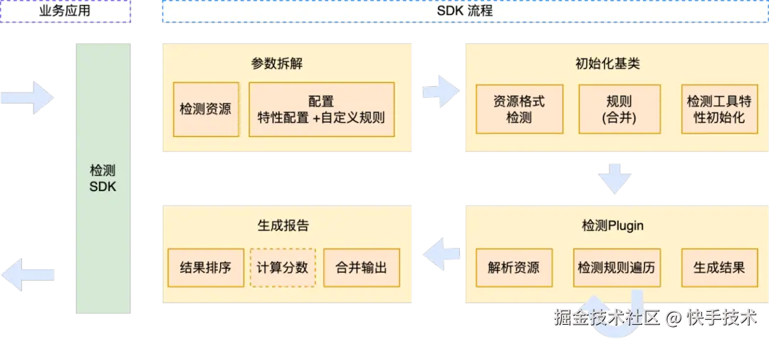 由于多条规则需要对同一套动效数据进行频繁计算,容易导致代码冗余。以 Lottie 检测为例,常规检测需要遍历超过 40 条规则,包括对 JSON 节点的归纳、层级深度分析、图片构造等操作。一个非标准的 Lottie 动效可能包含数百个节点和几十张图片,当项目集中检测时,底层服务的压力会呈几何式增长。为提高效率,SDK 对解码后的数据进行缓存,并通过校验插件进行遍历检测,从而更高效地生成静态检测结果。SDK 的具体流程设计如下图所示: