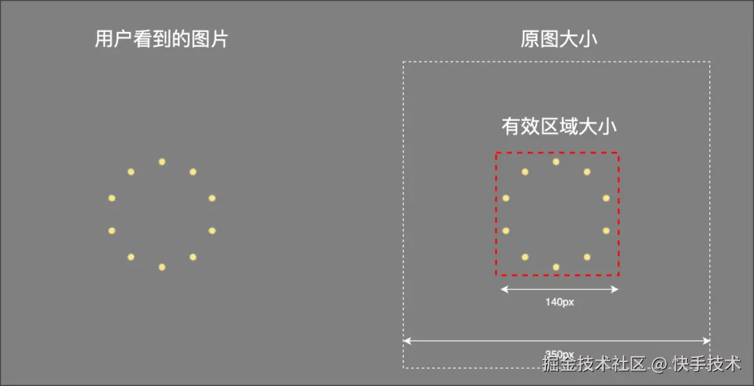 在设计初期,动效设计师为了实现高还原度的炫酷效果,通常会使用与画布大小成比例且便于对齐的图片资源。然而,由于 AE 导出切片(用户视口)的限制,一些包含大量透明通道的图片可能会被意外导出到动效资源中。以下图所示为例,一张有效展示内容区域为 140px 的 PNG 图片,实际使用了 350px 的图片,导致内存占用增加了 525%(尽管不同格式图片内存占用绝对值会有所不同,但比例趋势相同),这对页面整体性能有较大影响。因此,识别这些隐藏在合规资源中的异常图片,成为亟需解决的首要问题。