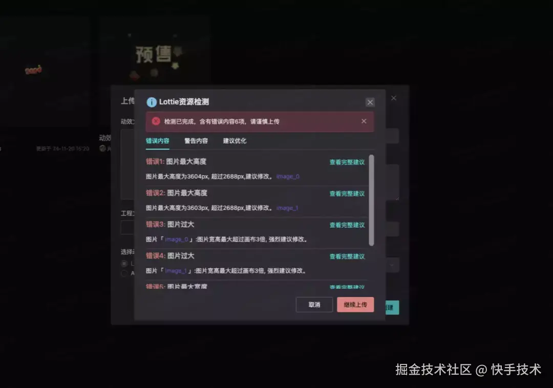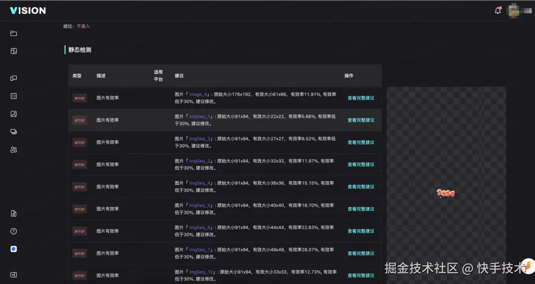 Vision 平台引入了资源准入和准出检测流程,在动效预览时对未通过检测的资源进行强制报告。后续的动效交付将从依赖 Docs 的方式转向平台化方案,通过统一的准入准出检测实现更好的管控和同步。