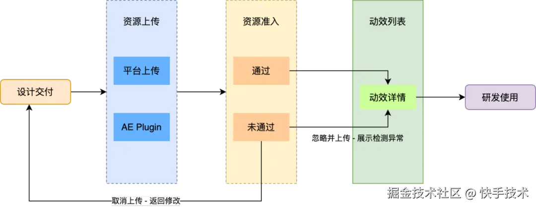 常规检测流程:动效设计师无论通过平台还是 AE 插件上传资源,如果资源触发静态检测异常,平台会强制提醒结果,但不会阻止动效的上传和使用。研发人员仍可正常下载和使用这些资源。