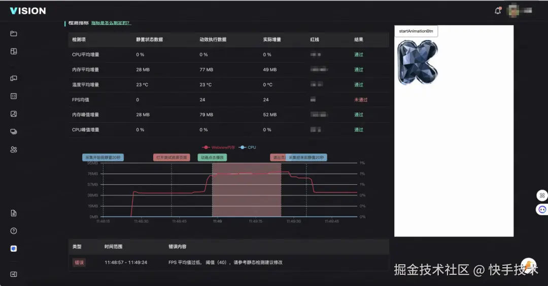 动效设计师上传的动效经过平台的静态检测后,具备了一定的质量保障。然而,为了避免因真机性能问题导致的开发返工,部分研发人员希望尽早进行真机性能验收。因此,在动效准出阶段,我们利用公司的云真机平台和性能检测工具,对单个动效页面或多动效集成页面进行真机性能测试。通过真机性能测试采集的数据,我们进一步分析了 CPU、内存、FPS 和温度等指标。同时,针对性能稳定性团队设定的指标红线,我们添加了相应的准出校验,以确保动效的稳定性和性能。