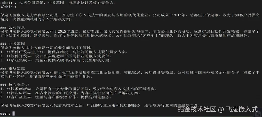 DeepSeek-R1能够快速检索并提供准确的信息。例如,当询问“保定飞凌嵌入式技术有限公司”时,DeepSeek-R1可以详细介绍该公司的背景、主营业务、产品特点等,帮助用户全面了解该公司的情况。